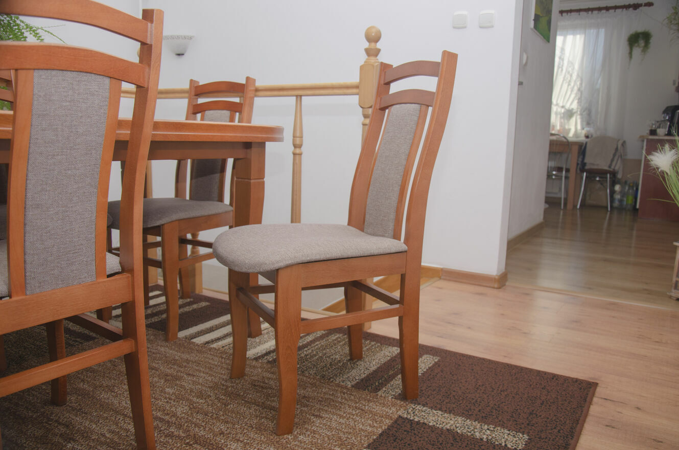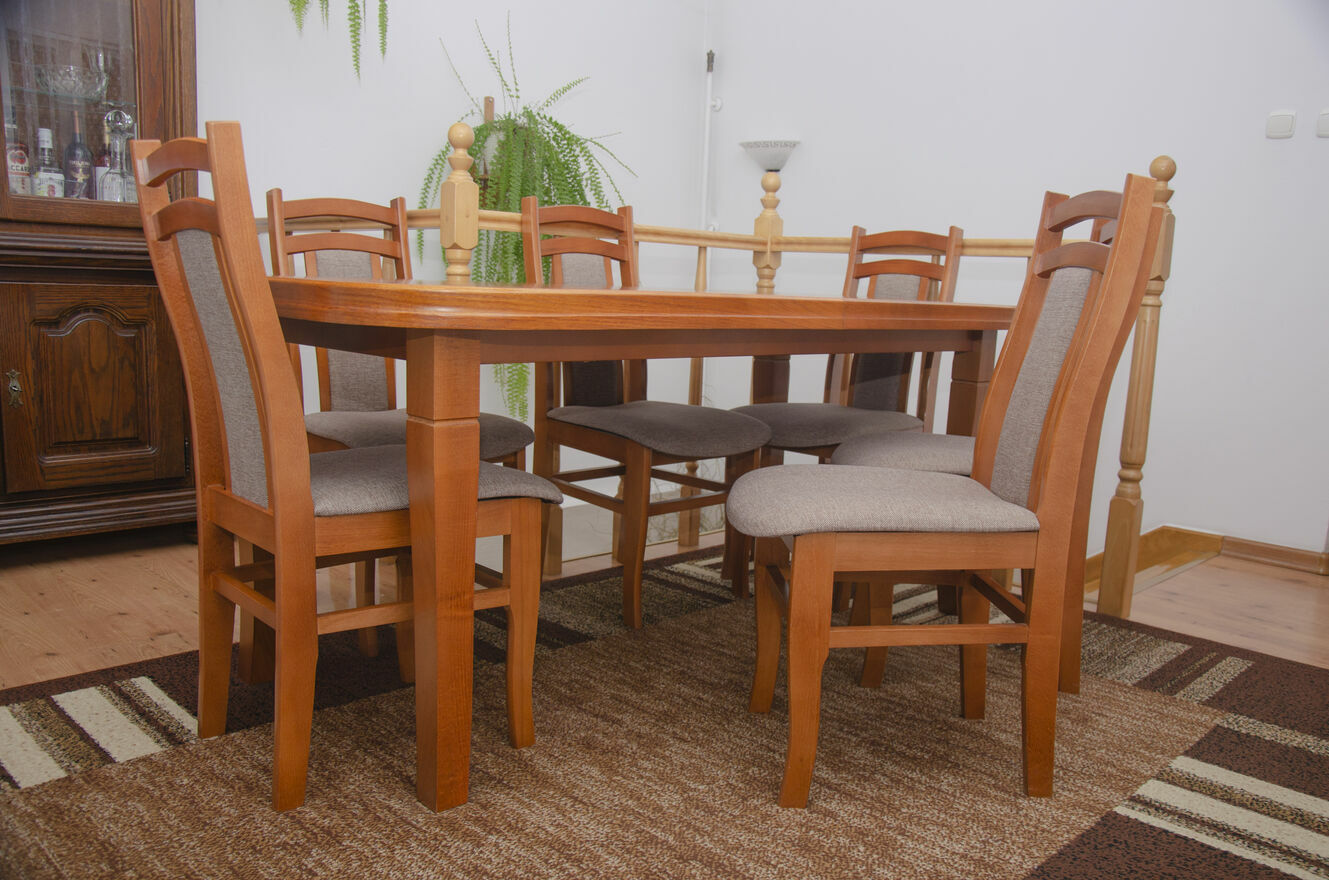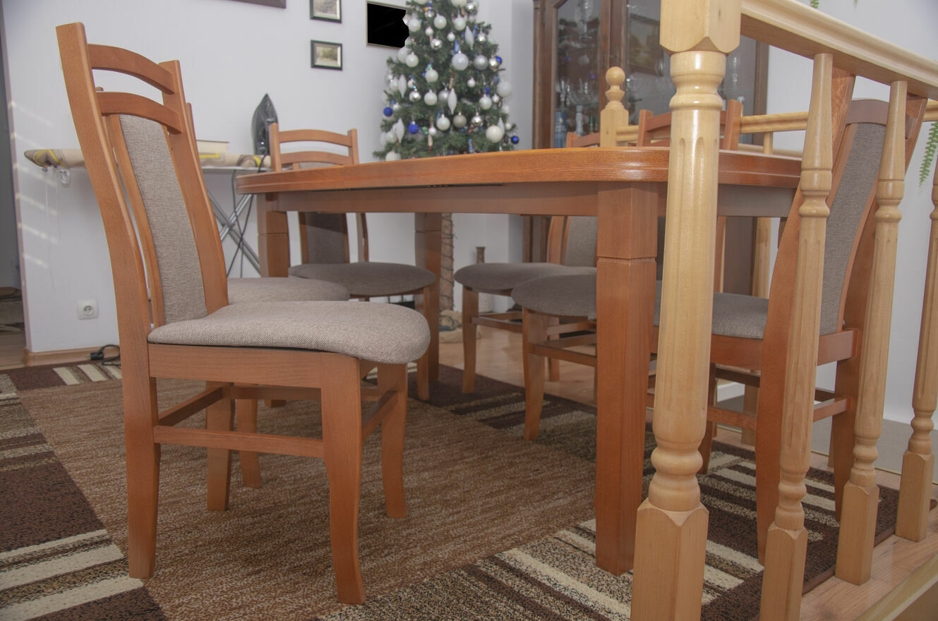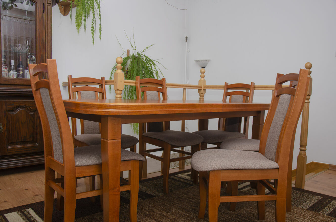 Stół jest stabilny, solidny i posłuży przez wiele lat. Krzesła wygodne, dobrze wyprofilowane, tworzą spójną całość z blatem. To mebel, który robi wrażenie i nadaje wnętrzu charakteru.