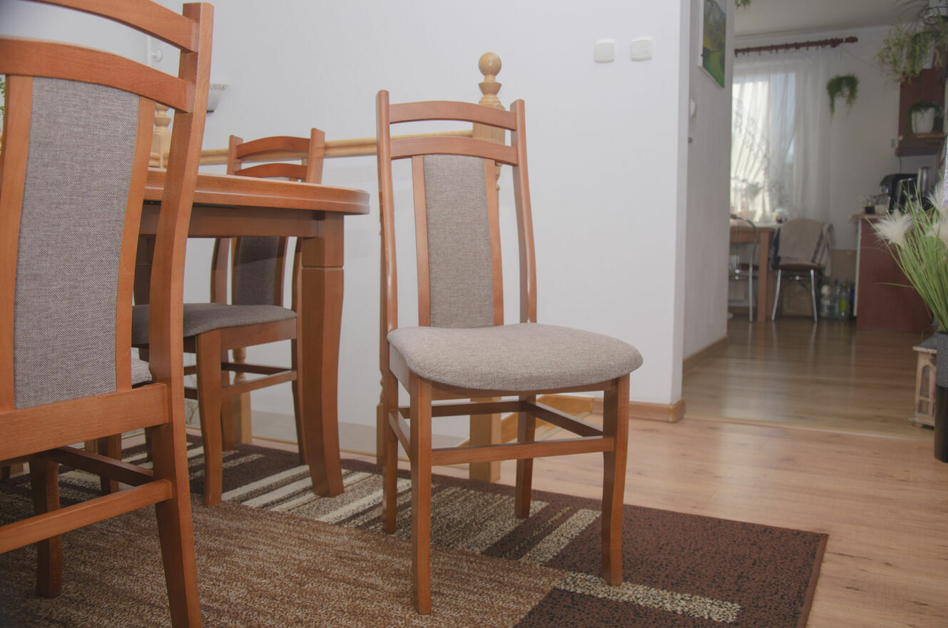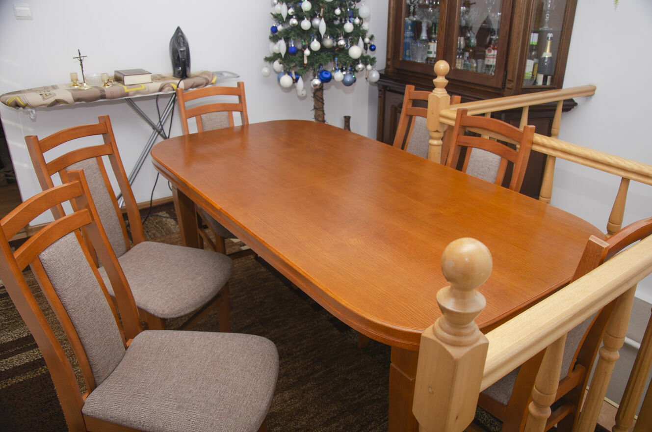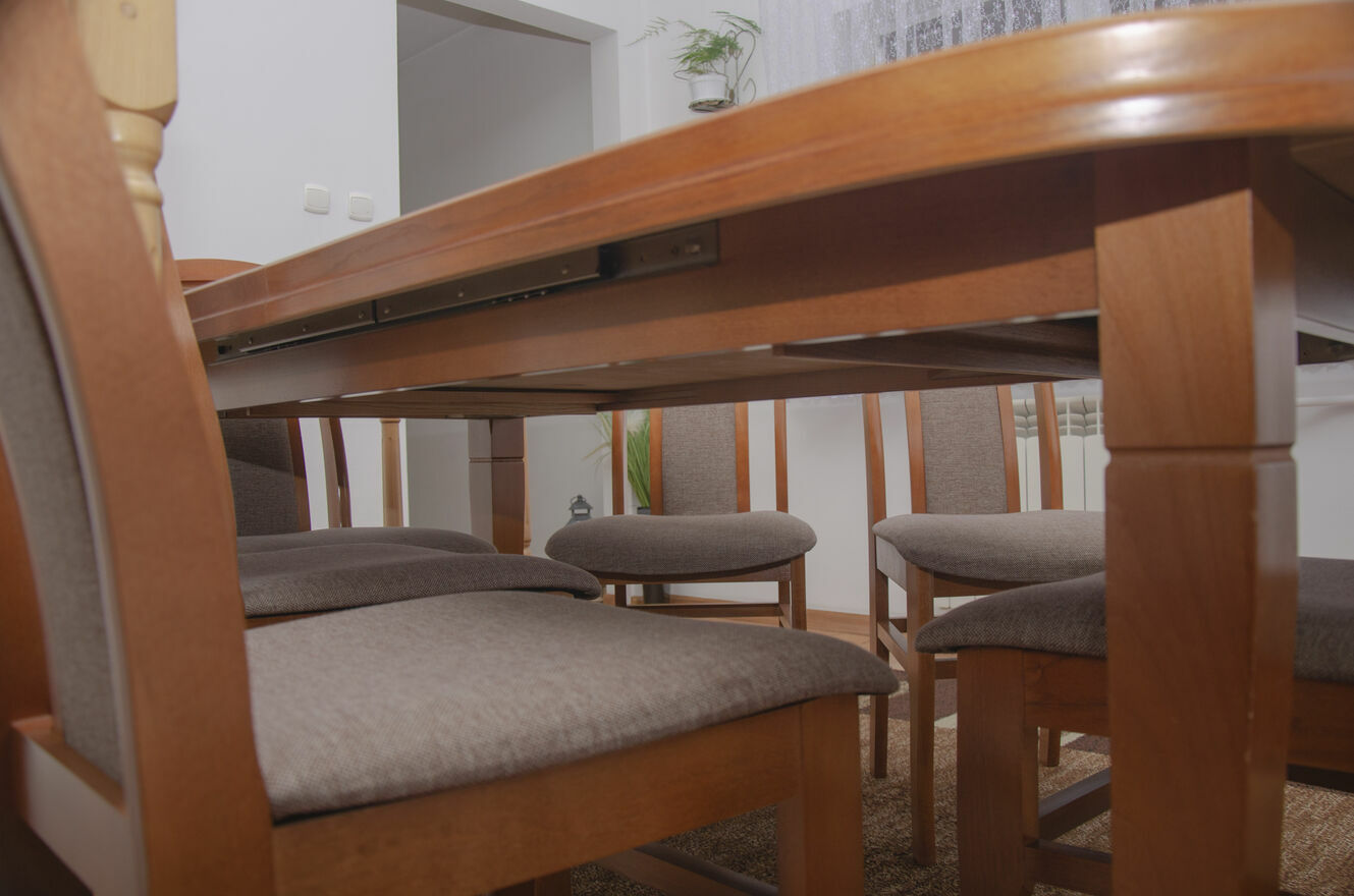 Stół jest stabilny, solidny i posłuży przez wiele lat. Krzesła wygodne, dobrze wyprofilowane, tworzą spójną całość z blatem. To mebel, który robi wrażenie i nadaje wnętrzu charakteru.
