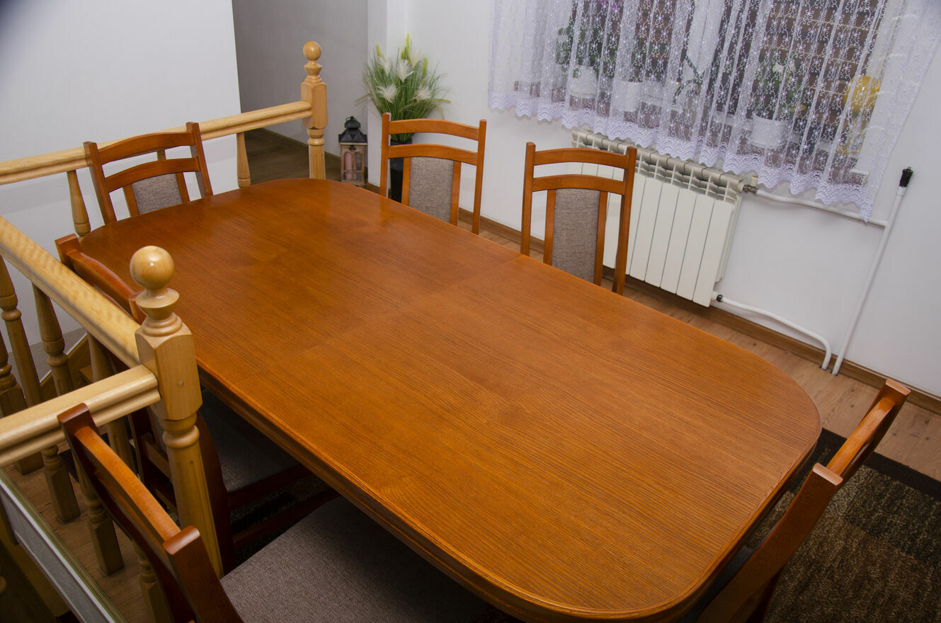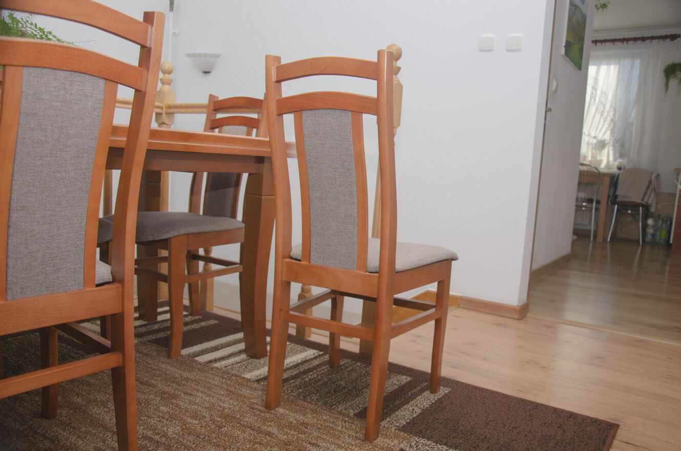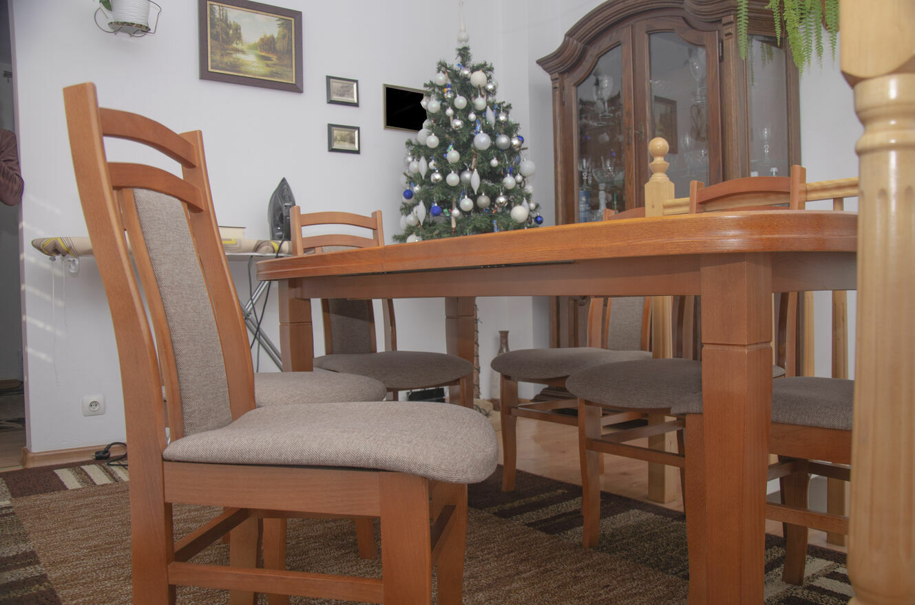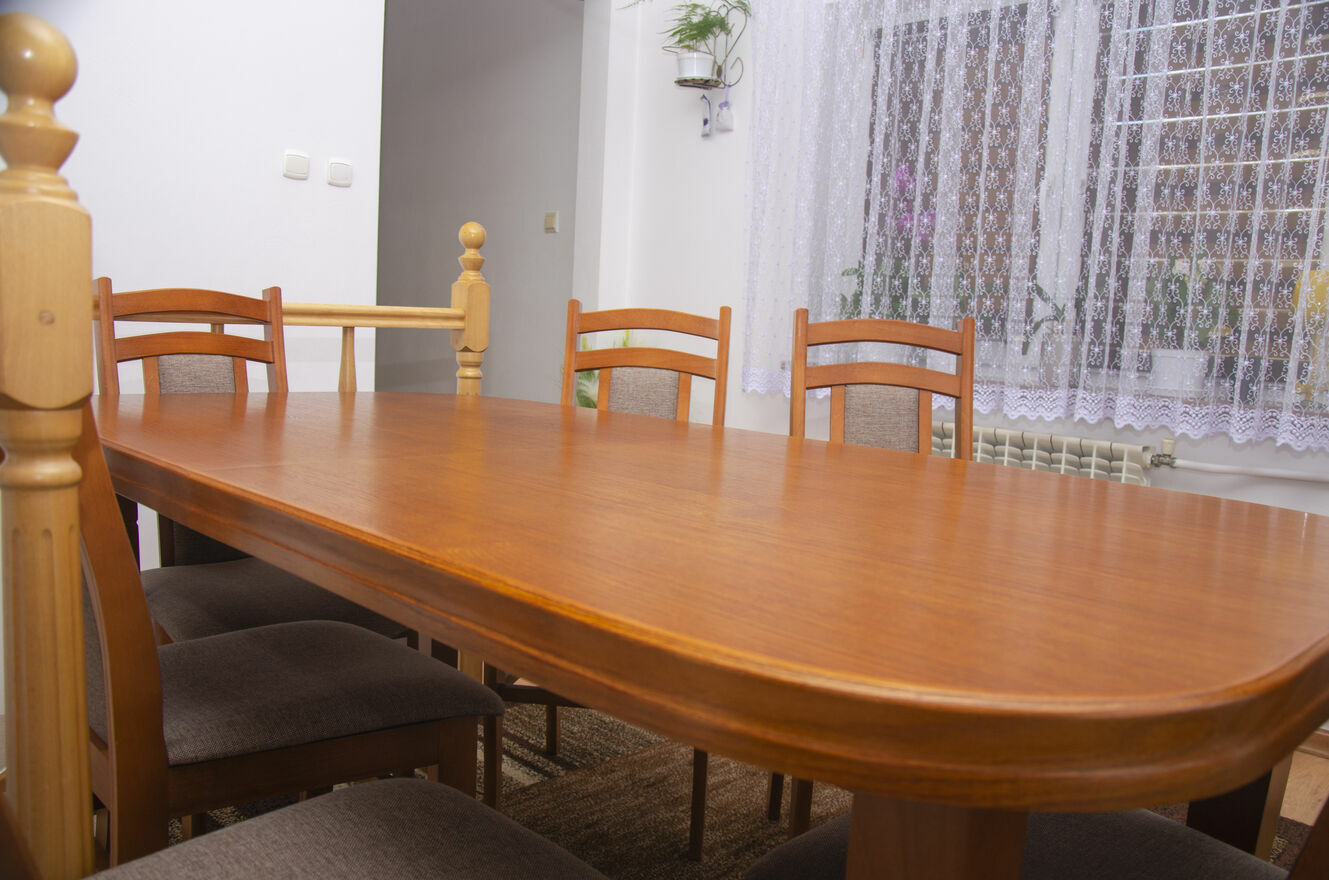 Stół jest stabilny, solidny i posłuży przez wiele lat. Krzesła wygodne, dobrze wyprofilowane, tworzą spójną całość z blatem. To mebel, który robi wrażenie i nadaje wnętrzu charakteru.